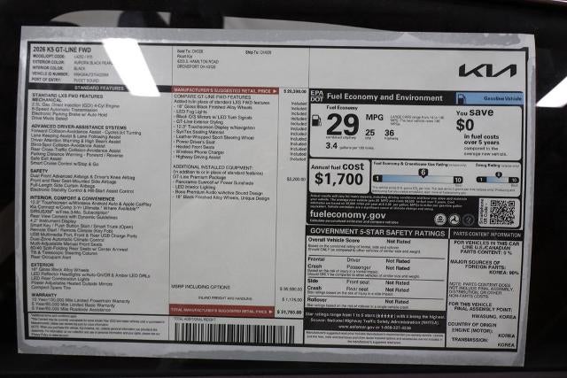 Aurora Black Pearl 2026 Kia K5 4D Sedan GT-Line I4 25/36 City/Highway MPG 8-Speed Automatic FWD